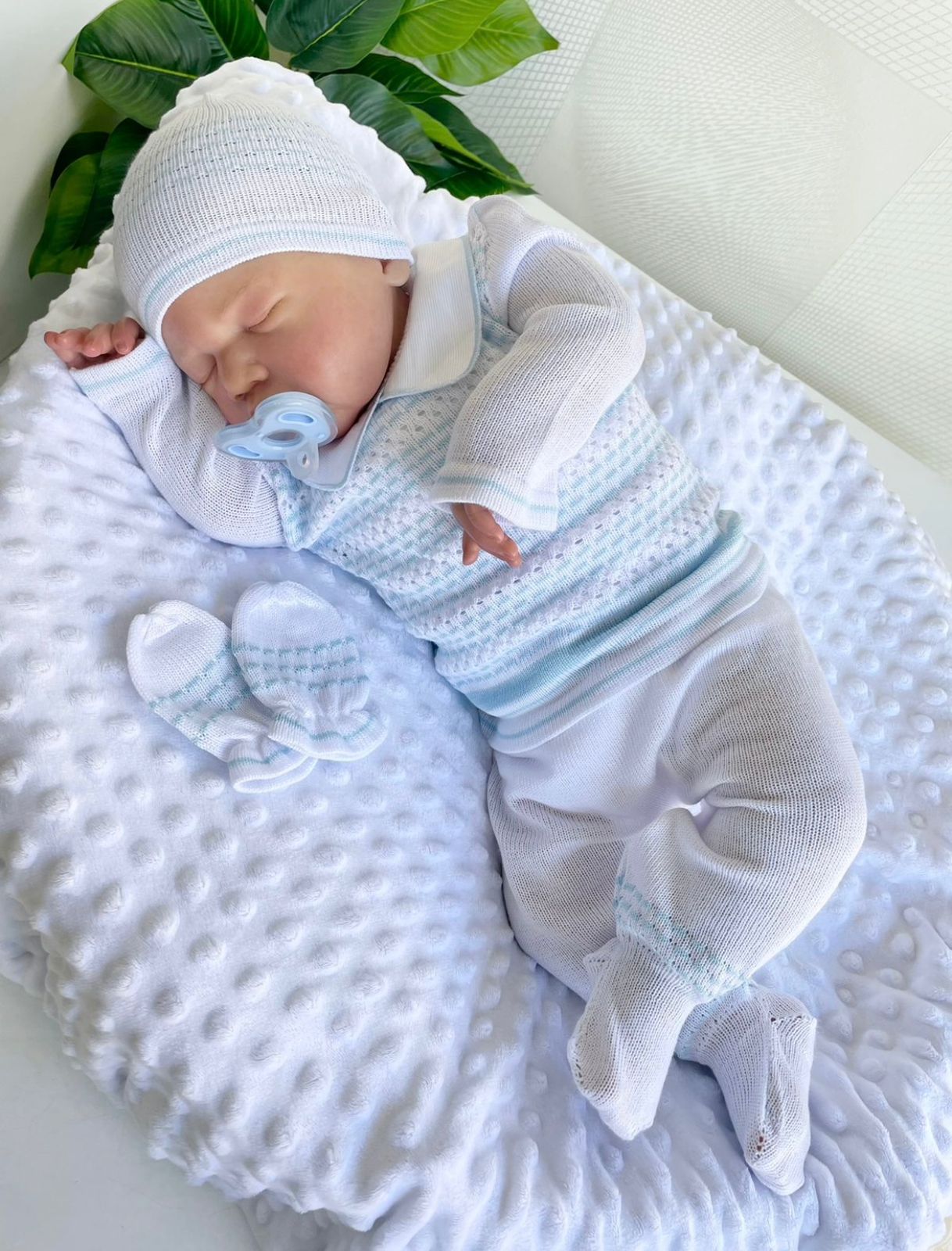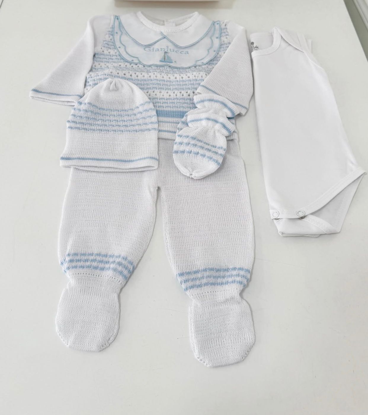 Incluye: Buzo, Pantalón, Bodi, Gorro, Manoplas, Babero para bordar el nombre del bebé.