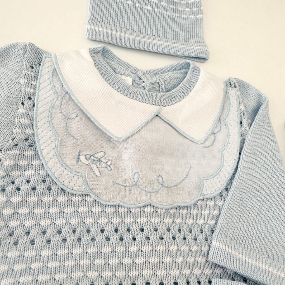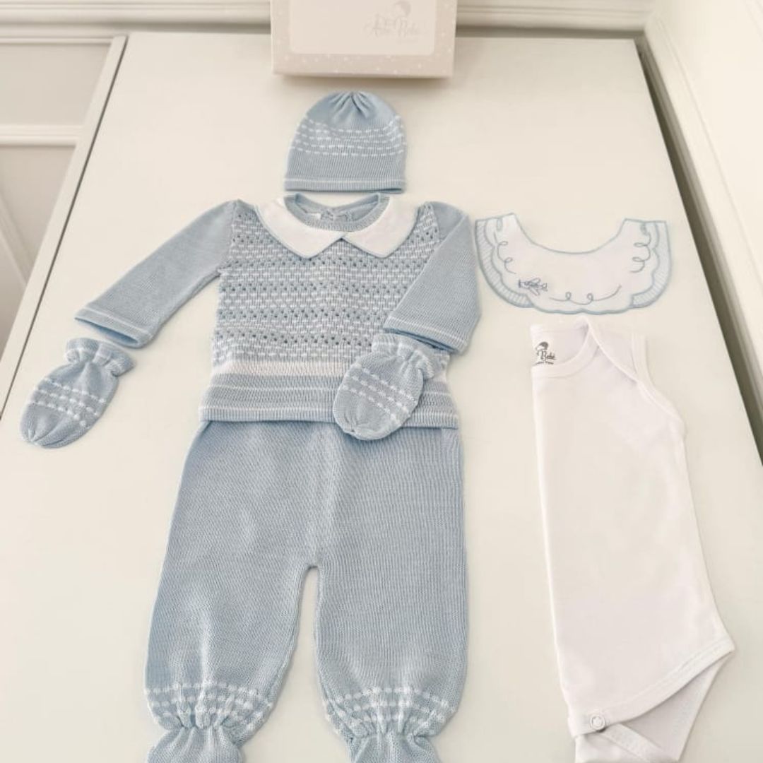 Incluye: Buzo, Pantalón, Bodi, Gorro, Manoplas, Babero para bordar el nombre del bebé.